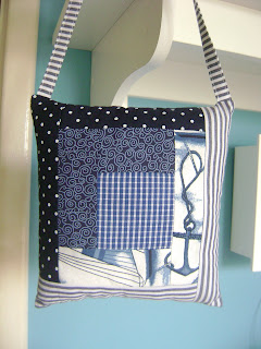 Como essa minha amiga mora em uma cidade praiana, fiz uma almofadinha em estilo navy, na técnica Log Cabin... que é uma delícia de fazer e tá virando um vício prá mim, ela tanto servirá como um sachê para armário, como um alfineteiro para o atelier...
